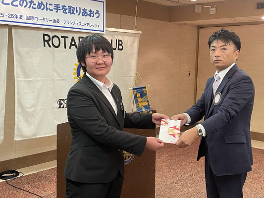 本日の卓話は、米山奨学生の林さんです。林さんの生まれ育った故郷のお話、岐阜県とほぼ同じ面積で人口2倍で、冬は-25~30度という気温。お米とカニの共生栽培をしていて低農薬で甘みのあるお米がとれるのだそうです。通っていた大学のこと、現在研究中の内容についての発表、そして今なぜこの研究をしているかというちょっとおかしな理由に 皆笑っていました。エトスに来てからの感想として、アットホームで雰囲気が良くて心が安らぎますと言っていただけたことに、会員はとても感動しておりました。あと半年もないですが、楽しみましょうね。